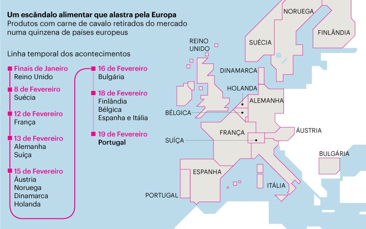 O escândalo da carne de cavalo rebentou no mês passado na Irlanda, depois de serem detectados vestígios em hambúrgueres de marcas irlandesas e britânicas, vendidos nos supermercados Tesco e Aldi. Só nas últimas semanas se começou a perceber a verdadeira extensão do problema, com o surgimento de casos semelhantes noutros países.